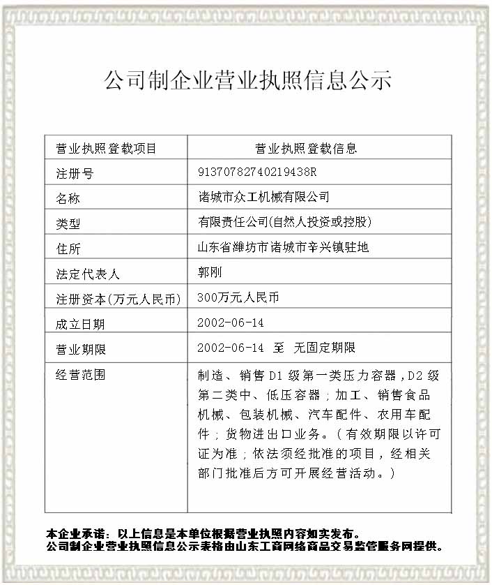 眾工公司創建于2002年,致力于從事智能食品機械設備制造,主要產品有:全自動殺菌鍋、新含氣調理殺菌鍋、夾層鍋、蒸煮鹵鍋、鵪鶉蛋生產線、鹵蛋、變溫壓差膨化、真空凍干設備等自動化設備,公司集研究、設計、制造、服務于一體,并擁有自主進出口經營權。公司被評為高新技術企業(證書編號:GR202237007238),擁有壓力容器制造許可資質(證書編號:TS2237350-2025),并成功通過了山東省質檢局的“KYL型殺菌鍋快開門連鎖裝置”的鑒定(編號:SY-WT-2010-0019),產品通過ISO9001國際質量管理體系認證......
