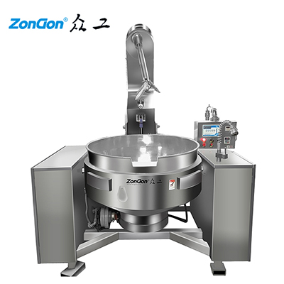 鍋體為一次沖壓成型的半球形不銹鋼鍋體;加熱方式可采用蒸汽、液化氣、天然氣等形式;行星攪拌即攪拌系統自轉公轉相結合,傳動比為不整數傳動比,保證鍋內無攪拌盲點,是新興的型攪拌裝置。
